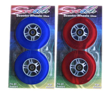 Includes 4 Wheels with Abec 7 Bearings. Diameter: 100mm. Durometer: 88a. Bearings: Abec 7 Rubber Shield Servicable. These high-performance, high-rebound scooter wheels were formulated specifically for street scooters. The 5-Star hub is designed to maintain strength & integrity of the wheel for riders who attempt extreme moves. Replacement wheels fit all 100mm type mini-scooters with and without suspension. Each bearing had dual rubber shields to protect the bearing from dust and other contaminates. The Shields are removable for routine servicing. Read more...